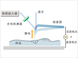 探針顯微鏡的原理 | 探針顯微鏡(SPM)是通過機(jī)械式地用探針在樣品表面移動,檢測出探針與樣品之間產(chǎn)生的力、電的相互作用,同時進(jìn)行掃描,從而得到樣品影像。探針尖端曲率半徑為10 nm左右。典型的探針顯微鏡是原子力顯微鏡(AFM),它通過檢測探針和樣品表面之間作用的引力和張力進(jìn)行掃描并獲得影像。探針顯微鏡能夠觀察納米級微觀形貌,可以捕捉到樣品最精細(xì)的一面。 |