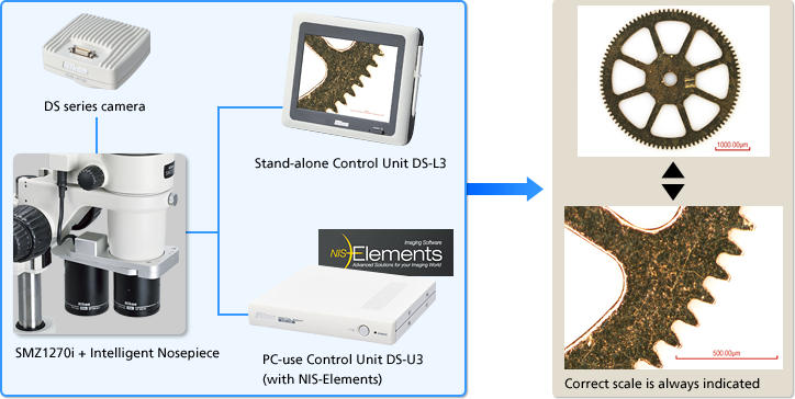 結(jié)合DS-L3相機(jī)控制器和NIS-Elements圖像軟件,SMZ1270i可以檢測(cè)變倍信息。同時(shí),配合智能型P-RNI2物鏡轉(zhuǎn)盤配件可以檢測(cè)當(dāng)前使用的物鏡。變倍信息結(jié)合物鏡信息,系統(tǒng)可自動(dòng)改變圖像標(biāo)尺大小,當(dāng)您在改變倍率時(shí)圖像中的標(biāo)尺與測(cè)量信息將會(huì)自動(dòng)對(duì)應(yīng)。