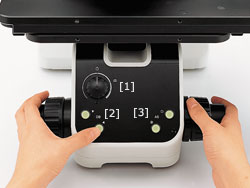 ![]() 前面板 [1] 照明強(qiáng)度旋鈕 [2] 物鏡倍率切換 [3] 孔徑光闌調(diào)節(jié) |