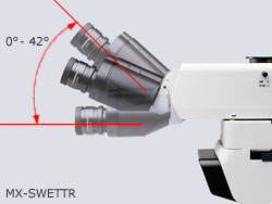 備有2種能以舒適姿勢(shì)觀察的傾斜鏡筒??梢愿鶕?jù)用途選擇雙目部?jī)A斜角度由水平0°到42°的、變化范圍大的MX-SWETTR型號(hào),或是目視和拍攝影像可同時(shí)觀察的U-SWETTR-5型號(hào)。 |