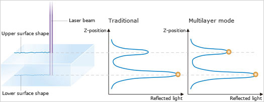 過(guò)去,激光顯微鏡焦點(diǎn)的位置都會(huì)設(shè)置在樣品上反射光強(qiáng)度最大的區(qū)域。但是,這樣的設(shè)計(jì)有時(shí)候會(huì)很難識(shí)別透明樣品的正確形狀,因?yàn)榧す夤馐鴷?huì)直接穿過(guò)樣品。LEXT OLS4000 全新的多層模式則可以識(shí)別多層樣品各層上反射光強(qiáng)度的峰值區(qū)域,并將各層設(shè)為焦點(diǎn),這樣即可實(shí)現(xiàn)對(duì)透明樣品上表面的觀察和測(cè)量,而且也可以對(duì)多層樣品的各層進(jìn)行分析和厚度測(cè)量。